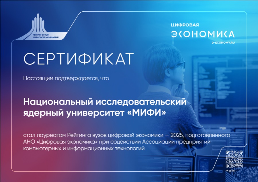 The National Research Nuclear University MEPhI received a congratulatory letter: "ANO Digital Economy congratulates the National Research Nuclear University MEPhI on its inclusion in the leaders of the national ranking of universities of digital economy in 2025. This is a significant achievement that confirms your significant contribution to the training of highly qualified IT specialists for the Russian digital economy. We wish your university continued continuous growth, new significant achievements and fruitful development!"